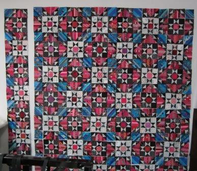 I got Star Struck top done late on New Years Eve. I asked you last week what boarder I should use. I also took the quilt over to my mom's and asked her for help. She is a very good quilter and level 3 judge with the Canadian Quilter's Association. I knew the answer before she told me. The pin wheels were too small in scale. They were smaller than the other units in the body and the scale was not going to work. So rather than fuss with more bigger units I decided to simply put the Dark Blue boarder on my quilt. I had never planned to make this a extra hard or fancy. I just wanted to do some simple patchwork and make a quilt for the living room. I started this on Nov 1st when Bonnie Hunter said she was going to do the mystery starting Nov 19. I could not wait I had to start something, so her Star Struck pattern it was. Now to add it to the pile of flimsies that need quilting ( build a backing too). Not sure when I will get it quilted. I have others in the line up. I am posting this to Patchwork Times Design Wall Monday.