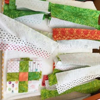 Wednesday in Progress, WIP, This is where I am at with the Bonnie Hunter mystery quilt. I am just starting step 5 and these little 9 patches. They are cute. I love how my greens and oranges are looking together. I still have the other units to cut for step 5, I only started step 5 on Sunday this week. Yes I am behind, many have their tops done. Slowly I go.
